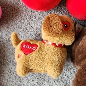 All brand new with tags. Super cute Valentine's Love themed bundle. Hershey's chocolate bear, pair of cherries, American greetings heart puppy, mini pink kissing emoji heart and Sweethearts Giggle plush.