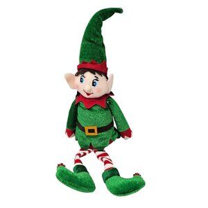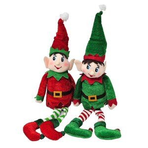 This set of 2 elves includes 1 elf with a green outfit and 1 elf with a red outfit. They have floppy legs and arms and a wire line elf hat that can be moved around.