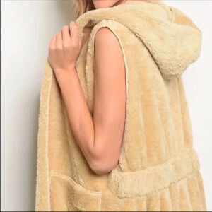 Plush hoodie vest in camel with two front pockets. 100% polyester. Brand new.