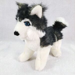 B.J. Toy Company 9 Plush Husky Wolf Sled Dog Standing Stuffed Animal Toy Blue Eyes. Unique rubbery/plastic eye lids. Shiny black fur. Beautiful plush. Excellent condition. Very light wear on paws from handling.