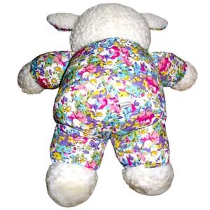 This is an adorable white plush lamb dressed in bright spring floral colors. Lamb has glass eyes that are sky blue with black pupils and plastic pink nose. The lamb is dressed in a floral outfit with pastel spring colors of pink, yellow, blue, and lavender. The inside of the lamb’s ears is lined in same material as outfit. The outfit is sewn to the lamb and cannot be removed. Lamb is 12 inches tall.