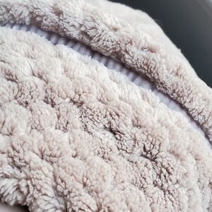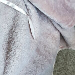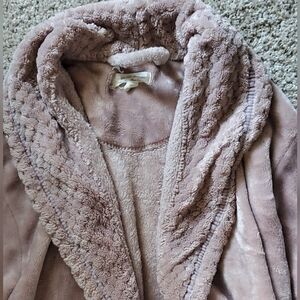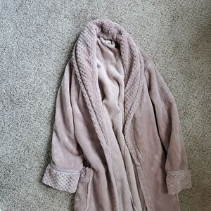 Soft plush long robe with shawl collar. Two front pockets with textured trim. Cozy and luxurious feel. Versatile lounge piece in a muted mauve/pink tone.