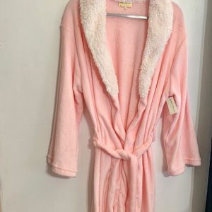 Super soft plush robe with waist tie robe. Considered a knee length. Medium size has small mark on arm of robe.