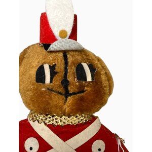 This vintage plush bear ornament, dressed as a soldier, adds a touch of nostalgia to holiday decor. Its charming design showcases a red and white uniform with gold accents. Ideal for collectors or those seeking unique decorative pieces, it brings character and warmth to any setting.