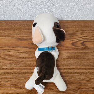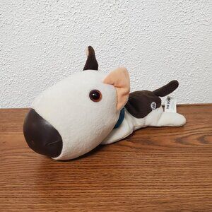 The Plush The Dog Artist Collection is a small brown and white stuffed animal featuring a bull terrier design with a leather nose. This adorable plush toy is perfect for any occasion and is suitable for children aged 3 and up with adult supervision. Its big head, big eyes, and big nose make it a charming addition to any collection of stuffed animals. Made in China, this unique and detailed toy is sure to delight children and dog lovers of all ages. Measures 10" x 5". Very good condition. The collar does have a little wear. Smoke free home.