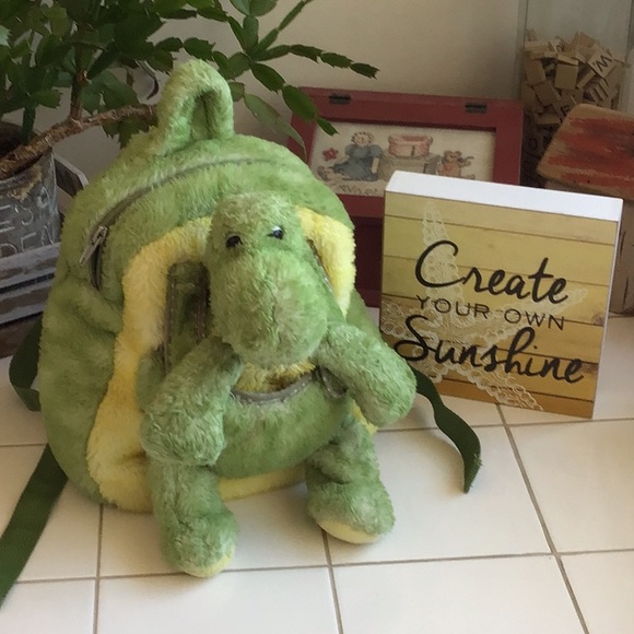 This gently used Plush Turtle w/Removable Turtle Shell Backpack has no rips/tears/stains (minus normal wear), is of Polyester/Cotton blend and hand washable. Backpack has padded/removable s/s 1”W, closes w/a nylon zipper, has front seat for cute Turtle. Turtle has button eyes and a 4”H nylon zipper back pocket. So cute and full of fun!