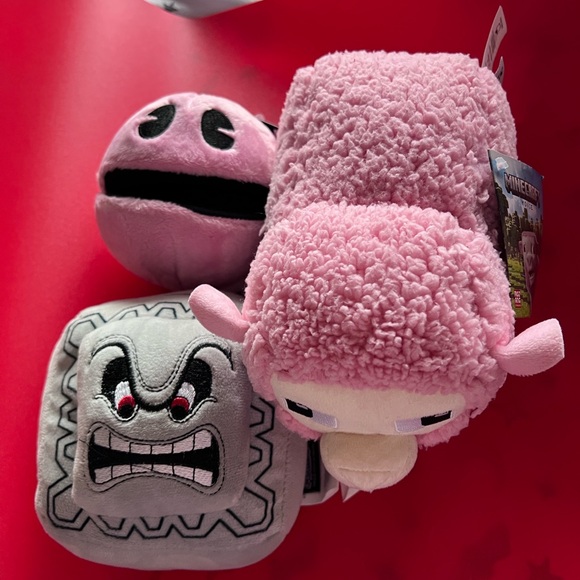 This includes Thwomp plush no tags, a pink PAC-man with tags, and the sheep from Minecraft with tags. All are in good condition, no stains or rips. Any imperfections, I do point out in the pics. All are stored in a pet and smoke free home.