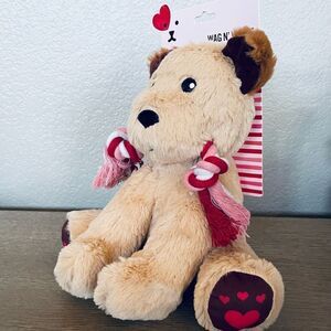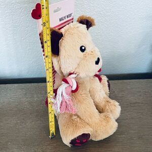 NWT adorable plush tan brown Valentine dog toy with braided red pink and white chew rope.