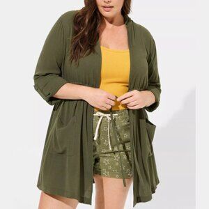 "Washable Gauze Hooded Kimono" by Torrid, size 3. This three-season, plus-size outerwear is in good condition. Light-to-midweight material is flowy in an earthy green.