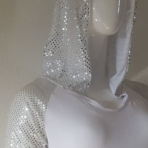 Raglan sleeve two-tone hi-low sports dress with front kangaroo pocket & hood. Knit fabric.