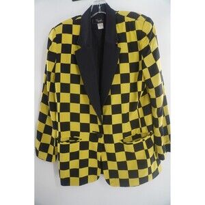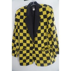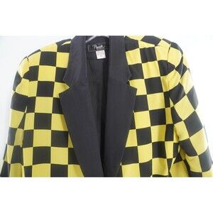 Pre-owned without tags plymouth Black & Yellow Checkered Statement Tailored Vintage Silk Blazer Size 8. Make a bold statement with this iconic, vintage Plymouth blazer, a perfect example of 80s or 90s fashion. This jacket features a striking black and yellow checkerboard print, black shawl lapels, and a single-button closure. The tailoring suggests it might have a slight shoulder pad for structure, typical of the era.