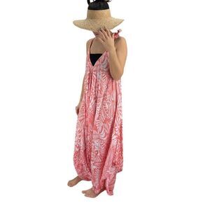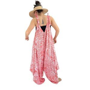The Po`a‘lima Coral White Tropical Floral Beach Ready Tropical Bohemian Wide Leg Jumper V Neck V Back Shoulder Tie Super Soft Rayon Material Handmade Each Romper is a Unique Pattern with in the Tie Dyed Colors.