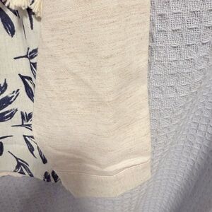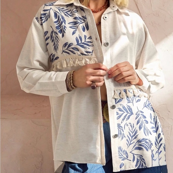 Stylish cream button-up shirt with blue leaf print. Features decorative tassels and buttons.