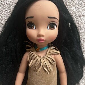 Charming doll featuring a tan dress and long black hair. Perfect for imaginative play.