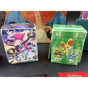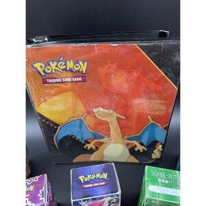 Pocemon storage lot with a Charizard binder (that shows signs of wear as pictured), tin, multiple boxes, and several different Pocemon card sleeves.