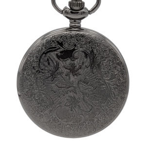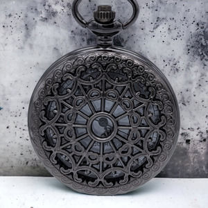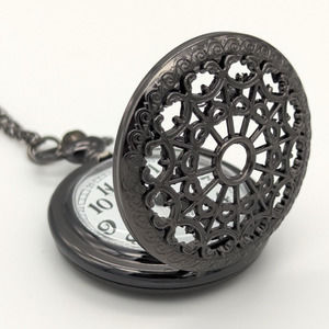 This stunning, functional pocket watch has a vintage charm. The gloss black finish is sure to turn heads and the intricate, cutout design makes this a great accessory for any occasion.