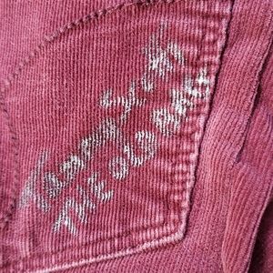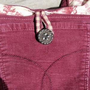 This cross-body bag is made from upcycled corduroys and scrap fabric. It has two exterior pockets and a button/loop closure. It measures approximately 6.5" × 6.5". Strap measures 54".