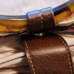 fall colored with leather accent and round handles and detachable shoulder strap