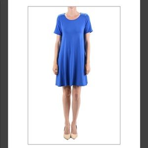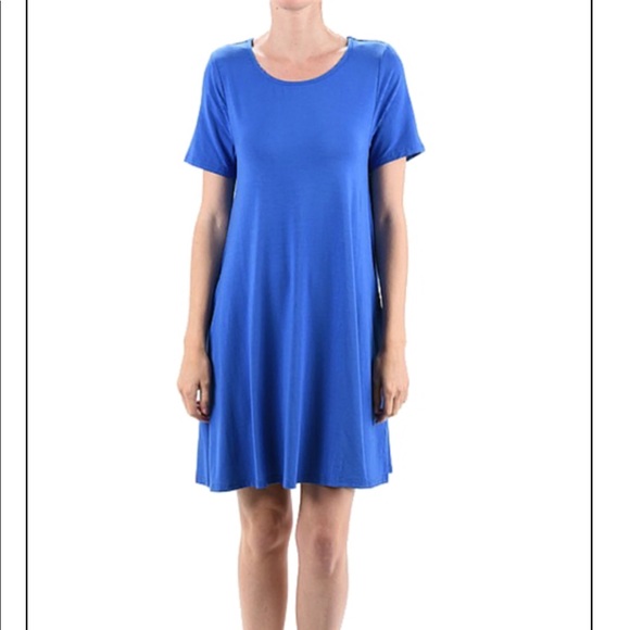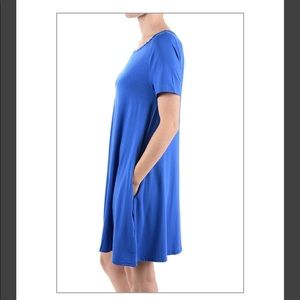 Short sleeve, moderate scoop neck, two inseam pockets..