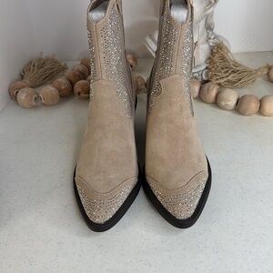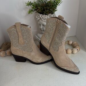 rhinestone detail, block heel, grip sole, stitch trim, size chart conversion may vary slightly by country 2in. heel mid calf boots 6in. shaft height, 12in. shaft circumference, taken from size 38 pointy toe, side zip closure suede upper.NIB