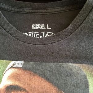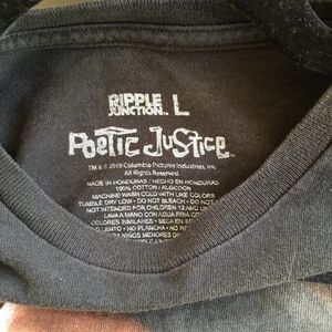This Poetic Justice graphic design t-shirt from Ripple Junction is a unisex black shirt in size L, featuring short sleeves and a regular fit. The shirt's theme is inspired by movies, music, 90s culture, and hip hop, making it a stylish choice for fans of these genres. Perfect for expressing your love for the iconic Poetic Justice film or adding a touch of nostalgia to your wardrobe.