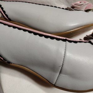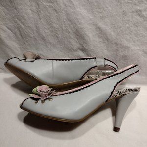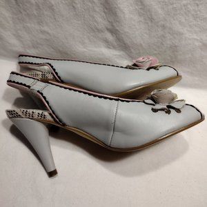 Grey sling back heels have a stretch elastic slip-on strap, scalloped in black; trimmed in pastels, mauve piping; paten mauve, lime green print & matching grey leather flowers.