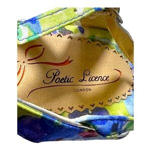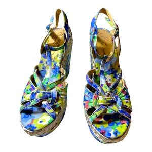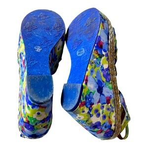 Poetic Licence Blue Silver "Arm Candy" Floral Watercolor Wedges Sandals size 9.5M looks brand new.There is a little tiny white spot on the right shoe see picture but you can’t hardly see it.