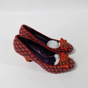 polka dot heels, orange bow pumps, jewel accent shoes, formal high heels, Poetic Licence shoes, mid-heel pumps, orange and red heels, stylish pumps, unique design heels, elegant party shoes, textured design shoes, women's formal footwear, cushioned insole shoes