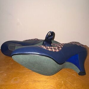 Elegant flats with blue toe. Features a colorful woven pattern. Satin ribbon adds charm.