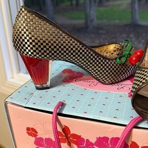 Chic peep toe heels with a checkered design. Adorned with a playful cherry accent. Perfect for a fun, stylish look.