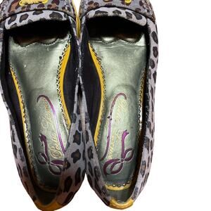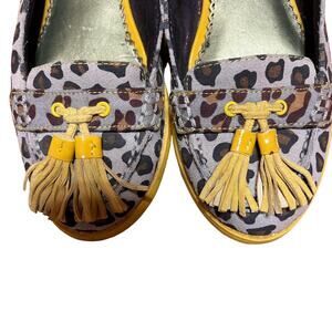 Stylish leopard print flats. Features yellow tassels and trim. Comfortable and chic design.