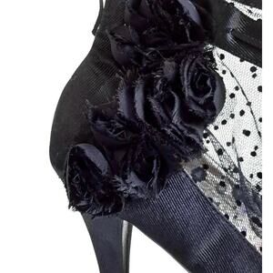 Step into the darkly romantic world of Poetic License with these “Sweet Dreams” London pumps. These statement heels blend vintage allure with gothic glamour. Featuring a soft black suede base, delicate polka dot mesh panels, oversized rosette details at the toe, and an edgy ankle cuff, these shoes are made to turn heads—day or night.