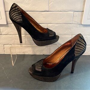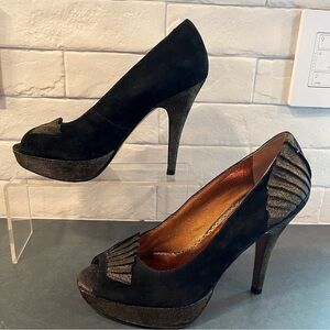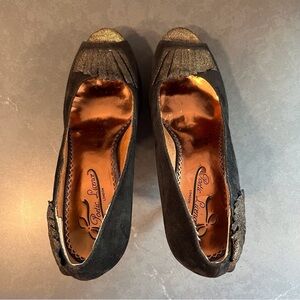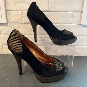 Poetic License sz 7.5 Egyptian Princess black suede and gold platform heels