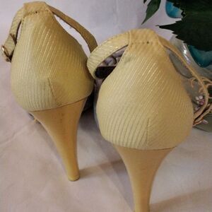 Style: Exclusive Delight. Super cute T strap heels with great features: yellow fabric heel and straps with buckle, yellow patent heel, gray fabric straps and rosette. Size 8 has 4 inch heels. Excellent condition. Fun and whimsical.