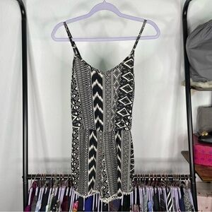 Size small. Cream and black colored. Spaghetti straps. Pom Pom fringe. Elastic built into the back and waist.