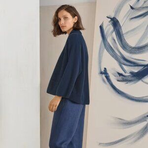 100% cashmere Hand wash or dry clean Soft and luxurious cashmere All-over half-cardigan stitch Wide and boxy fit Dropped shoulders Doubled shawl-collar into placket Real horn buttons, a by-product from the food industry Wide bracelet-length sleeves Little patch-pockets Angled ribbed back shoulder detail Fully-fashioned to create shaping Model Photo shows sleeve length