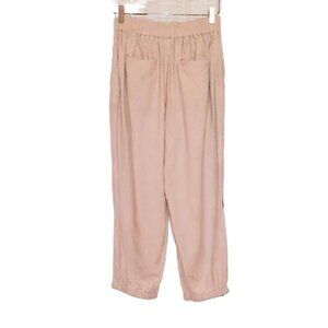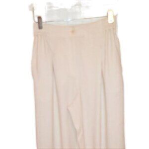 Comfortable cropped cream pants with elastic waist. Ideal for casual wear. 55% Linen / 45% Viscose. Two front pockets at seam. 2 back pocket. Elastic bottom legs. 34" length, 24" inseam .Relaxed, tapered leg and cropped trousers. Pleated front.