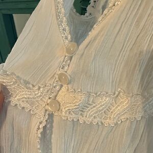 Elegant sleeveless top. Lightweight fabric. Delicate lace trim. Perfect for layering. Model is ai.