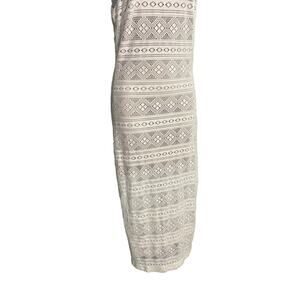 Make a statement with this stunning, intricate crochet lace midi dress by Poetry. The beautiful white and tan geometric and floral pattern creates a boho-chic vibe, while the form-fitting, bodycon silhouette offers a Sleek, modern look. The halter neckline with a small keyhole detail adds a touch of elegance, and the back slit ensures ease of movement. Fully lined for comfort and modesty. In excellent, like-new condition with no flaws. Perfect for a summer wedding, a special night out, or a warm-weather vacation.