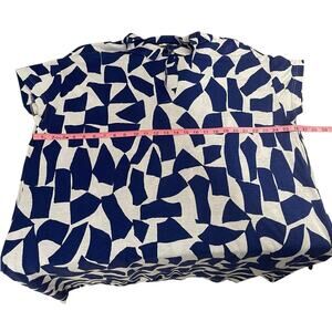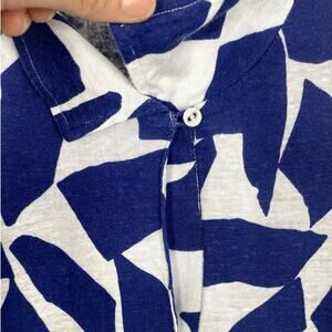 Linen cotton blend short sleeve shift dress. One button at neck, pockets. 60% linen, 40% cotton. Blue and white. Size 16. Please see photos for measurements.