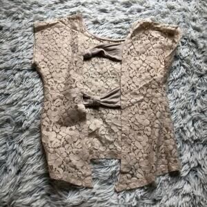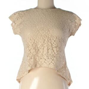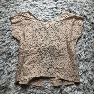 Size small short sleeve blouse from Poetry Clothing. Beige / off white lace crochet design with a cutout open back. Crew neckline. Super cute & chic. Slightly cropped. Good condition.