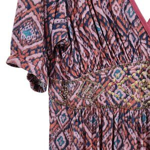 Poetry Women's Mosaic Print Beaded V-neck Linen Blend Maxi Dress - 10