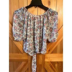 Poetry Women’s Sheer Button Up Tie Front Short Sleeve Blouse floral size small pit to pit 20” length 22” (1557)