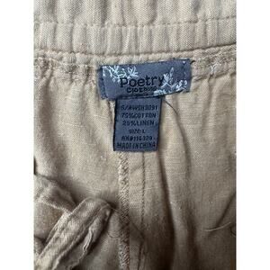 Good used condition- Linen, cotton blend. Waist is 17” length is 11”. Low-rise, short, short. I would said these fit more like medium, than large.