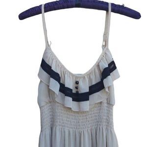 Sheer empire cinching with ruffle and button detailing adjustable spaghetti straps fully lined cream with black accents mini babydoll sundress by Poetry.