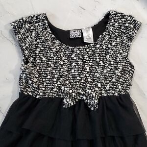 Top portion of dress is a soft, bumpy silver metallic, white and black boucle material highlighted by a matching bow