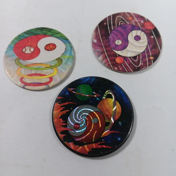Set of three cosmic-themed Pogs Features vibrant yin yang designs. 1 metal 2 not.
