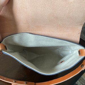 Adjustable strap, handle and honey leather closure. Waterproof acrylic outer fabric on rest of bag. Cotton lining inside.
