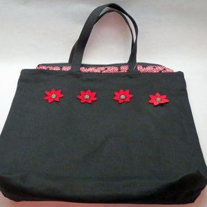 Outer bag is black cotton denim decorated with poinsettia appliques and green buttons