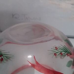 Pre-owned in good used condition. Glass Bowl with red poinsettias with gold glitter. The rims red.The bowl is approximately 5 inches tall and the mouth of the bowl is approximately 4.5 inches.There are some imperfections that are pictured.